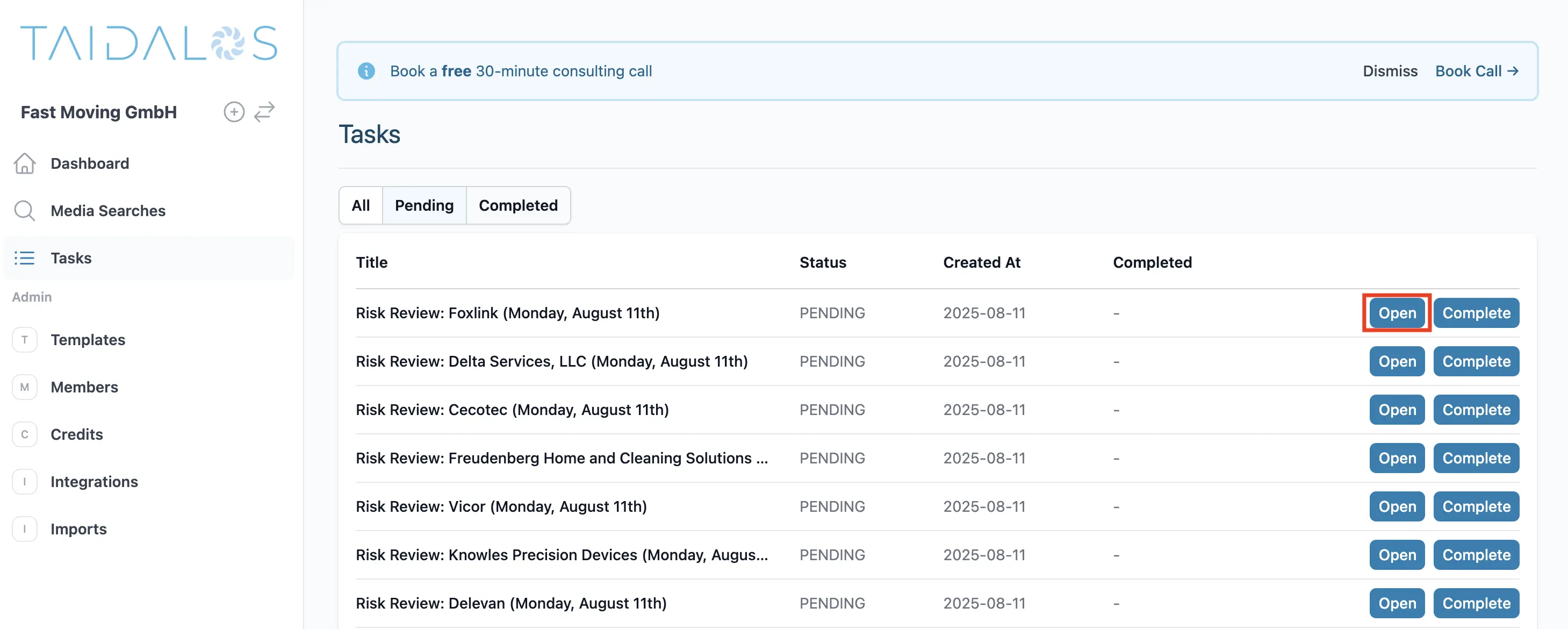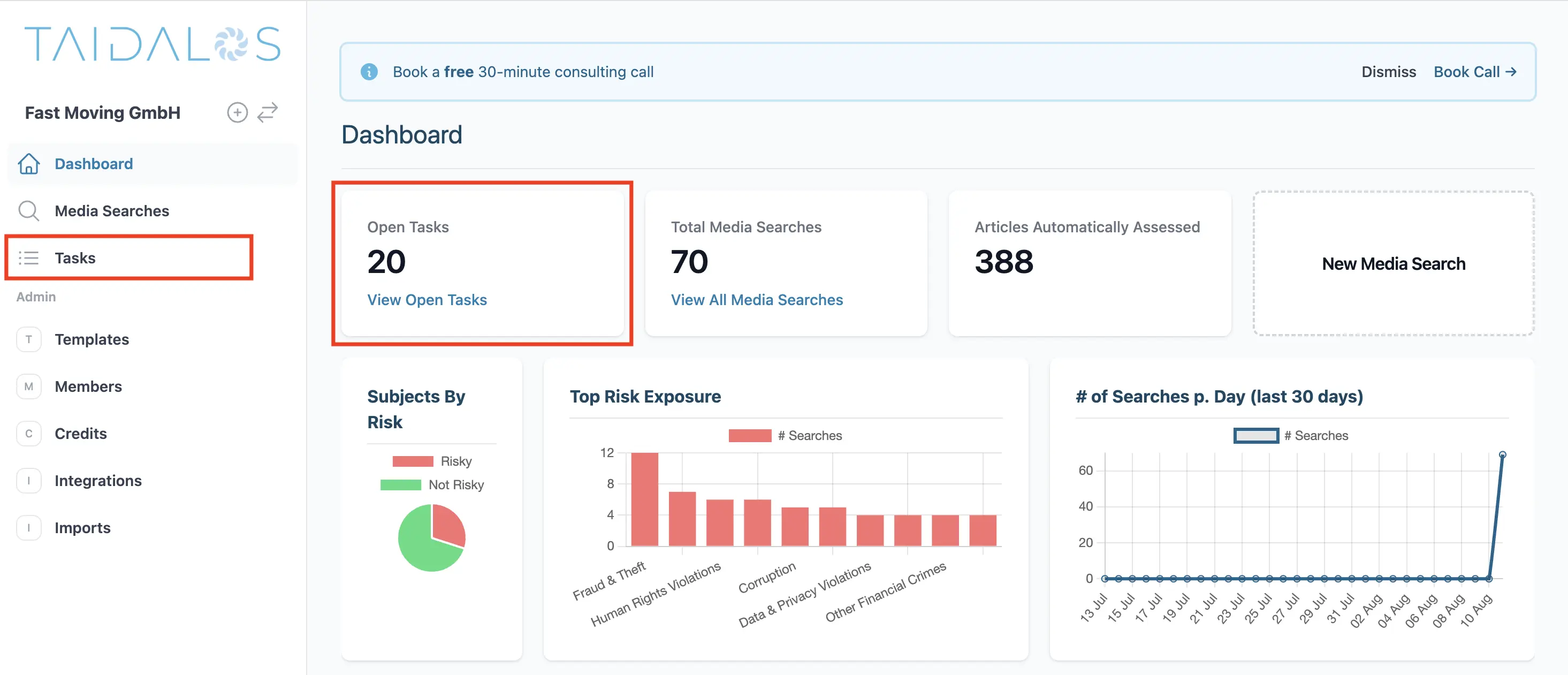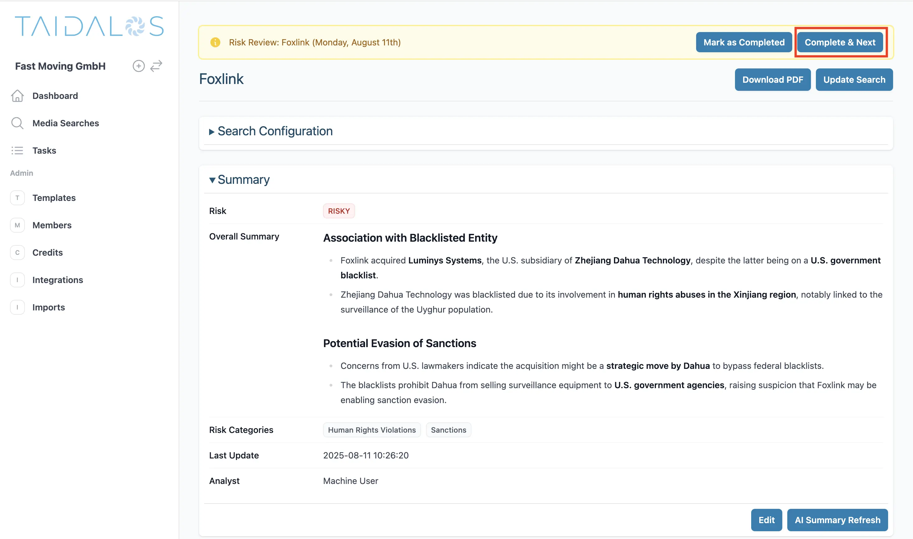 The system creates a review task for every search with a RISKY overall risk assessment.